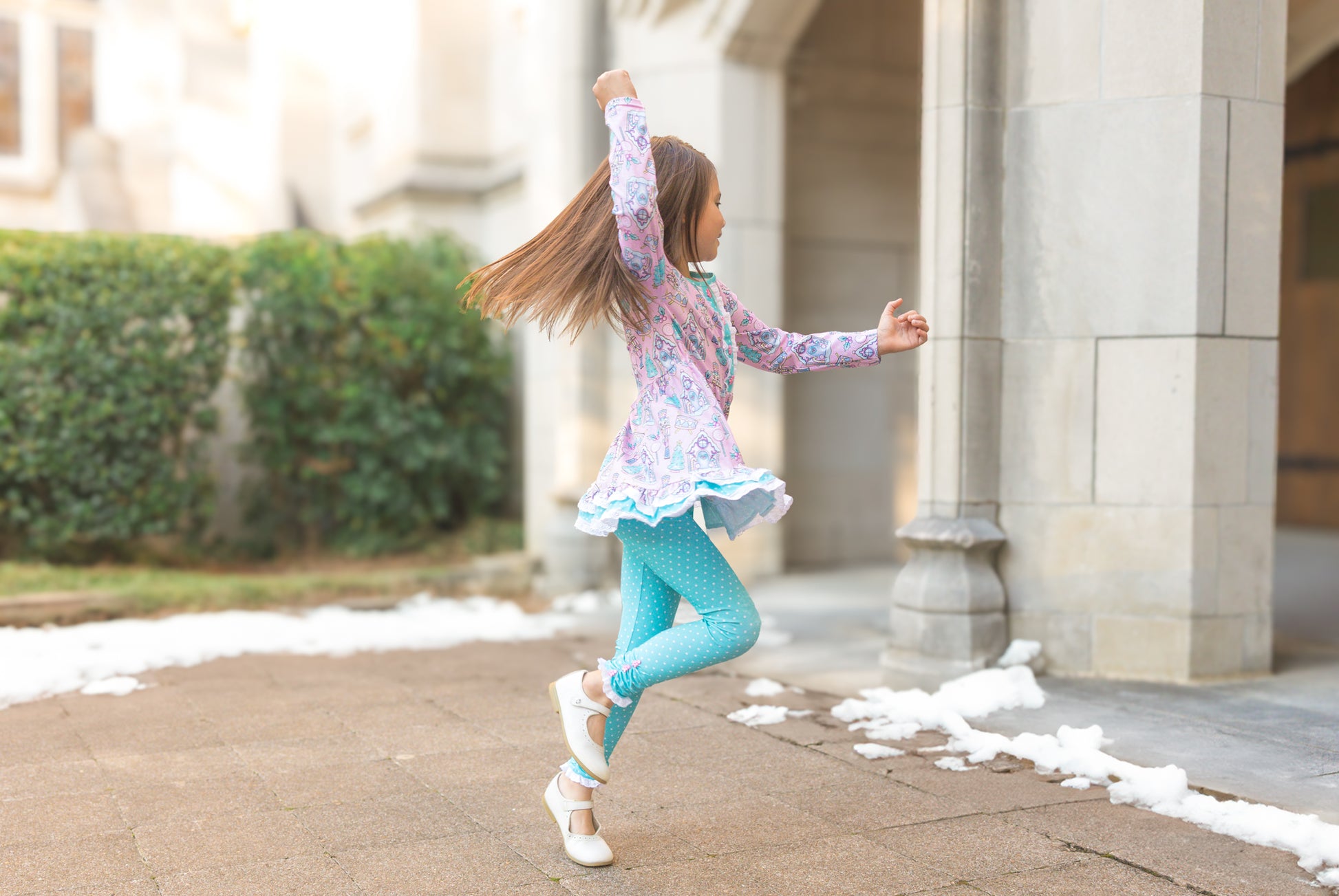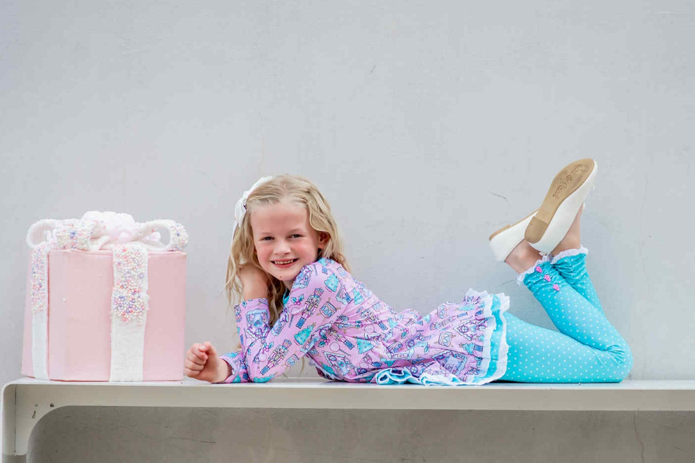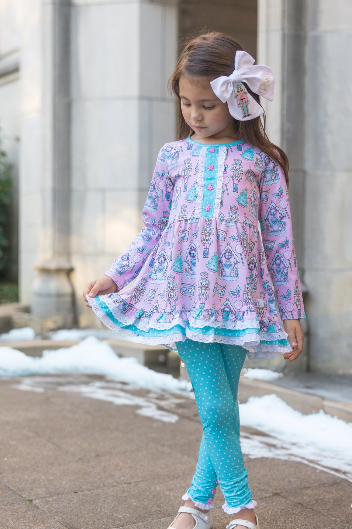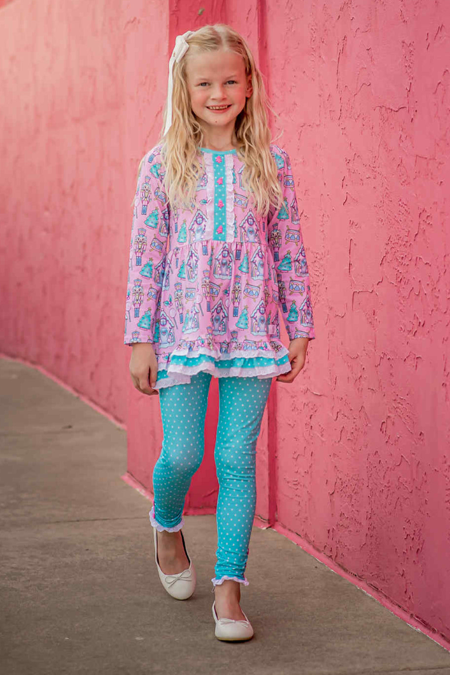 This adorable holiday playset has the most festive pink nutcracker print. Perfect for both play and those sweet holiday picture moments.